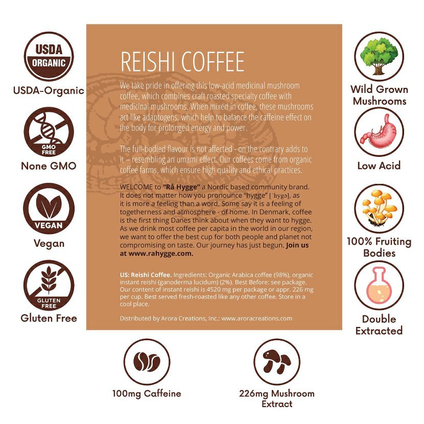 Zloženie: BIO Arabika (98%), dvojitý extrakt z BIO reishi (2%) z toho 30% polysacharidov a 2% triterpénov. Suroviny nie sú geneticky modifikované. Obsahuje betaglukány, ktoré harmonizujú imunitný systém a majú priaznivé účinky na hladinu cholesterolu v krvi.